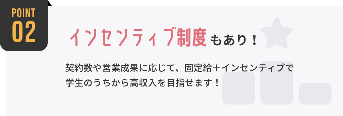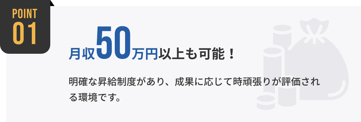 基本給とは別に、成果に応じたインセンティブを支給しています。契約件数や営業成果に応じて報酬が加算されるため、頑張った分だけ収入が増える仕組みになっています。