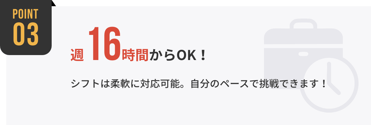 週16時間以上の勤務が目安ですが、学業との両立を考慮し、柔軟に調整が可能です。授業やテスト期間など、シフトの相談も遠慮なくしてください。